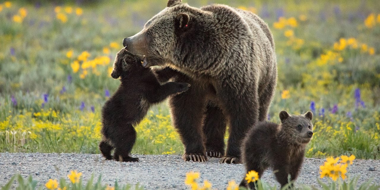 I arrived on Pilgrim Creek Road in Grand Teton National Park and was stunned by the beautiful yellow and purple wildflowers that carpeted the landscape. I stared out into the wildflowers, willing a bear family to become the central characters in this magical landscape. As if on cue, grizzly bear 793, also known as “Blondie,” emerged from the woods with two bear cubs in tow. She led her cubs through the wildflowers and, as if to show off her pride and joy, began to play with them right in front of me. I photographed this tender moment that she shared with her cubs before she made her way across the field and back into the woods.